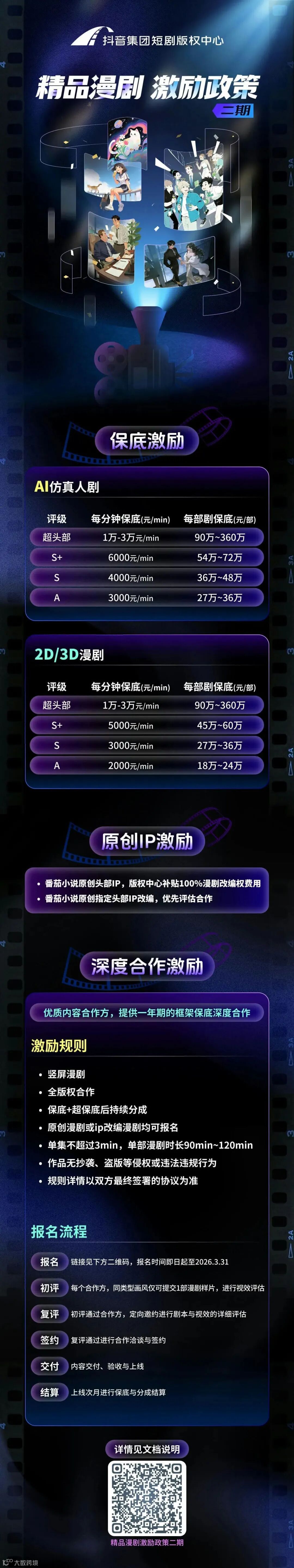 1月21日晚,抖音集团短剧版权中心公布了第二期精品漫剧激励政策,主要面向AI仿真人剧和2D/3D漫剧,涵盖保底激励、原创 IP 激励、深度合作激励三类核心权益,单部保底最高可达360万元,如果是改编番茄小说原创头部IP,补贴100%漫剧改编权费用。(来源:抖音集团短剧版权中心)