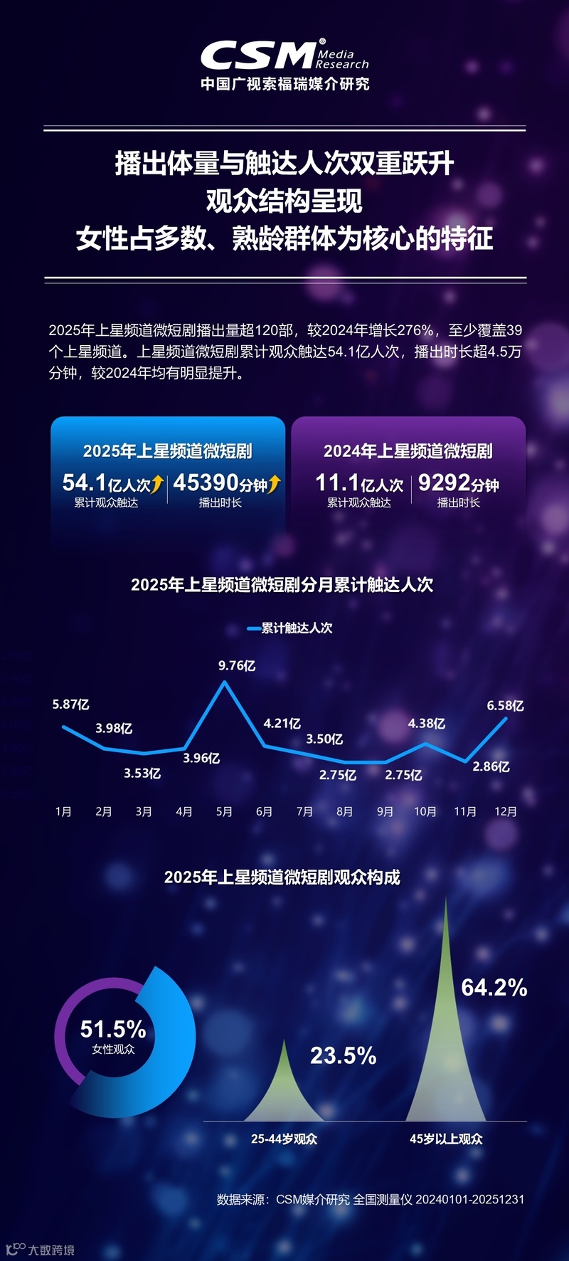 近期,中国广视索福瑞研究报告发布,其中显示,2025年,微短剧上星实现播出体量与观众触达的双重爆发式增长。上星频道微短剧播出量超120部,较2024年增长276%,覆盖至少39个上星频道;累计观众触达达54.1亿人次,较2024年的11.1亿人次实现数倍增长。观众特征明显,女性观众占比51.5%,是主要受众群体,45岁熟龄人群占比64.2%,成为大屏微短剧的核心人群。(来源:收视中国)