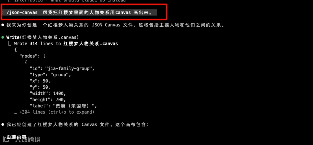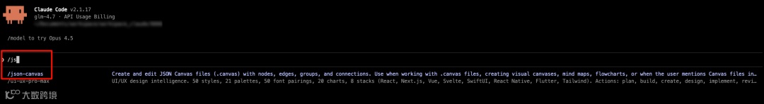 打开 claude ,然后输入 /json-canvas 下面如果有智能提示,代表已经可以正常使用了。