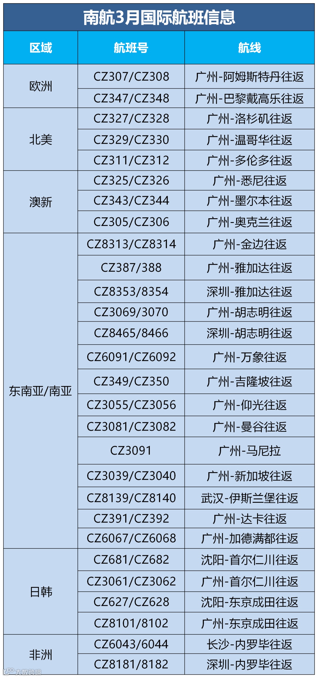3月,南航每周可执行国际航线共计28条,以下为具体航班计划。
