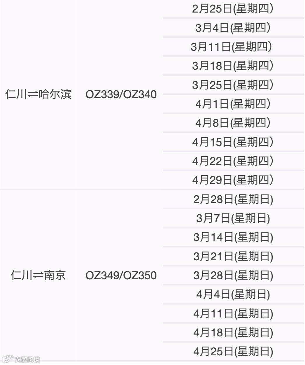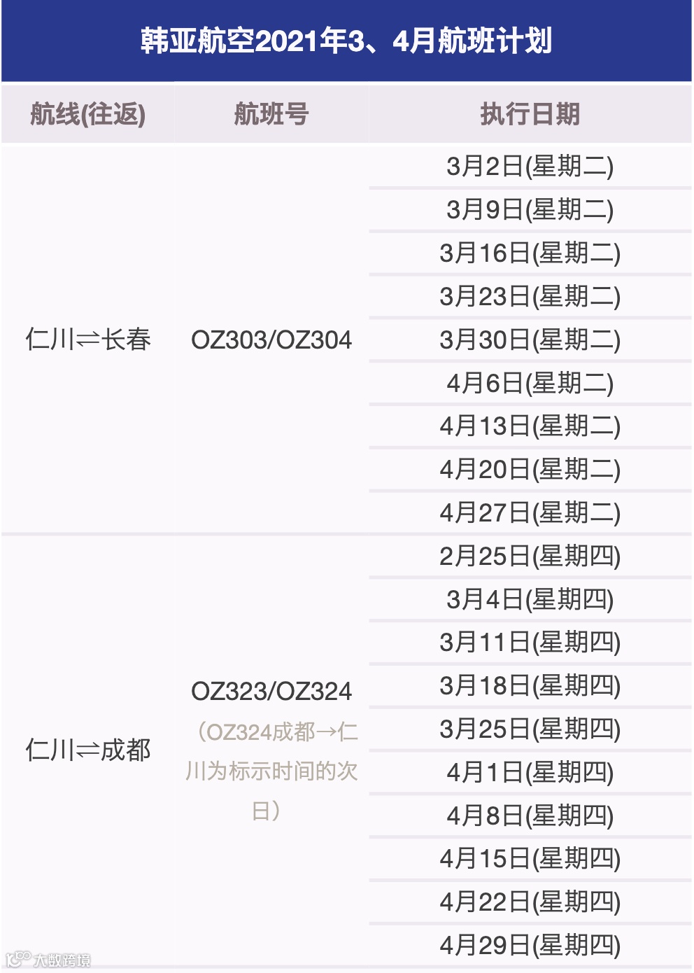 韩亚航空2021年3月、4月韩国往返中国大陆地区最新航班计划如下