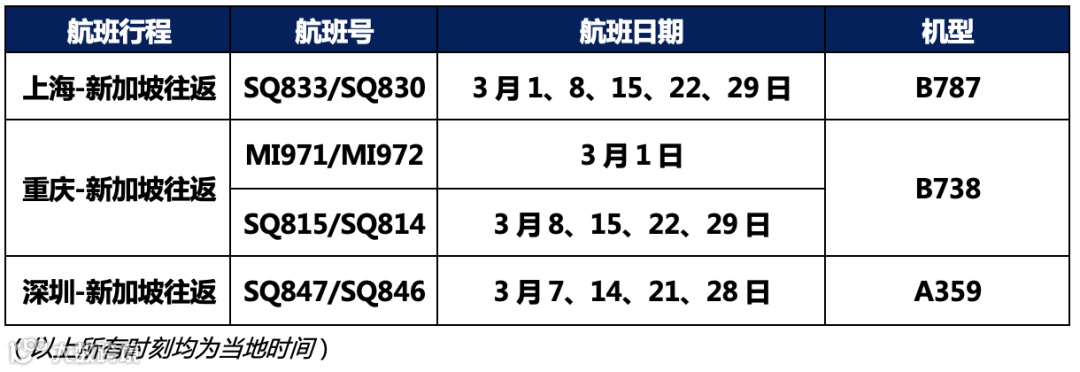 新加坡航空及胜安航空于21年3月1日 – 21年3月31日期间在中国大陆地区将运营以下航线及航班:
