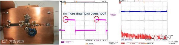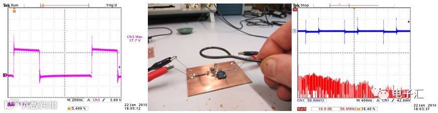 最终方案下,开关波形过冲完全消除,环形天线检测到的辐射接近本底噪声(图14)。