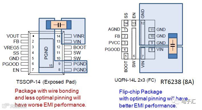 Buck转换器的主要辐射源是输入切换回路,其布局直接影响EMI性能。封装形式对优化布局至关重要。