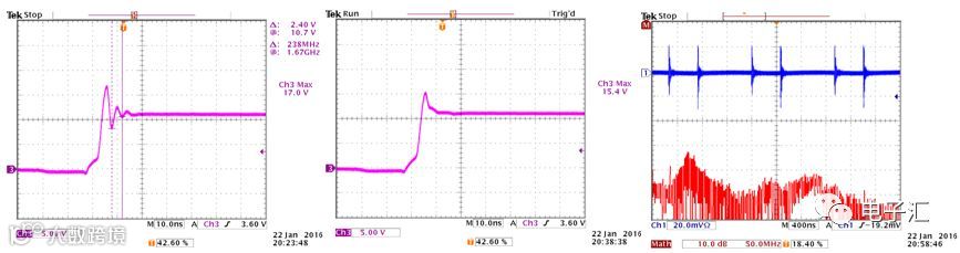 初始状态下(无Rboot与RC缓冲),开关波形有过冲5V,振荡频率238MHz,共模电流噪声显著(图20)。