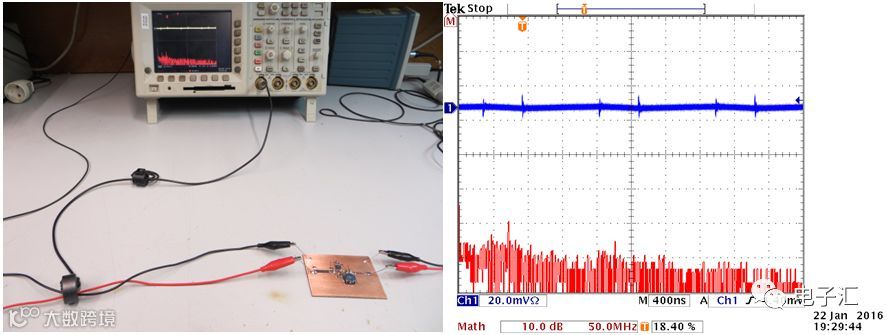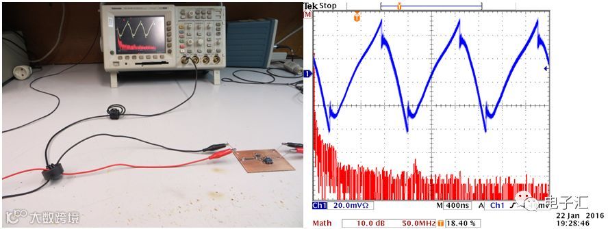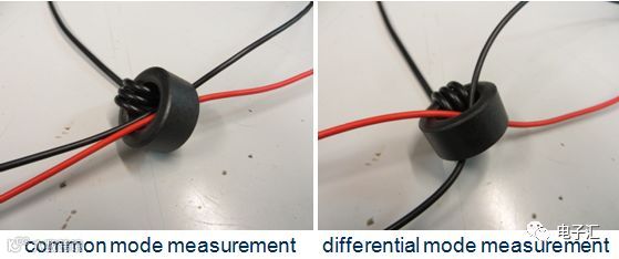 通过正负线穿入自制电流探头磁芯(方向一致测共模,相反测差模)实现分离测量(图16)。