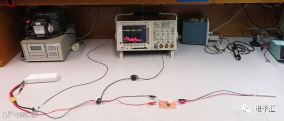 电源采用三节串联锂离子电池(约12V),避免与其他设备共地;电池端并联电解电容以抑制电感谐振。负载为1Ω电阻并联10µF MLCC,提供3A负载且对高频信号呈现低阻抗。输入线接地侧通过100Ω电阻连接实验台地,模拟LISN网络阻抗特性。