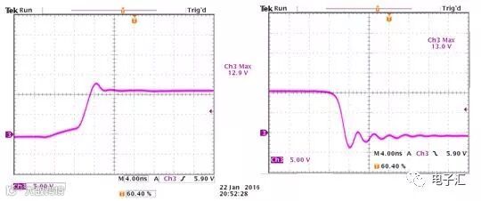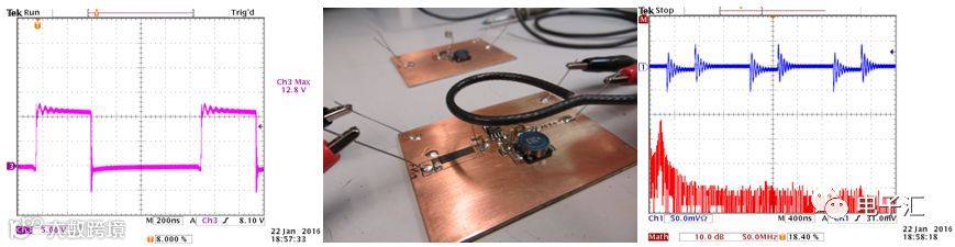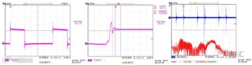 环形天线探测发现,在输入环路上方存在强烈辐射(达200MHz),同时开关波形出现严重过冲与振铃,已接近IC耐压极限(图7)。