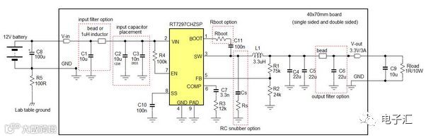 本文以RT7297CHZSP(800kHz、3A输出能力的电流模式Buck转换器,PSOP-8封装)为例,探讨不同PCB布局和滤波策略对电磁干扰(EMI)的影响。测试条件为12V输入、3.3V/3A输出,通过自制EMI检测工具结合示波器FFT功能分析高频噪声特性。