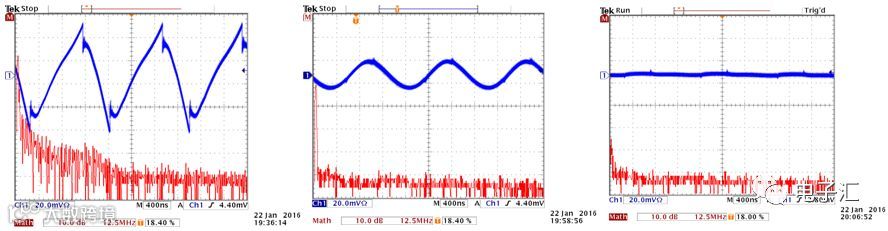 | 测量3.3V输出端差模信号的方法 | 无滤波器 | 使用22µF MLCC + 4A磁珠(BLM18SG700TN1)滤波器 |