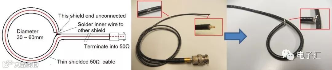 使用50Ω同轴电缆绕制小型环形天线(图30),连接频谱仪或示波器(50Ω输入),扫描PCB上方磁场分布。