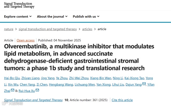 This Phase Ib study (NCT03594422), reported in the published paper titled Olverembatinib, a multikinase inhibitor that modulates lipid metabolism, in advanced succinate dehydrogenase-deficient gastrointestinal stromal tumors: a phase Ib study and translational research, was led by Prof. Ruihua Xu, Academician of the Chinese Academy of Engineering, and Prof. Haibo Qiu, at Sun Yat-sen University Cancer Center. The study evaluated the safety and antitumor activity of olverembatinib in 66 patients with unresectable/metastatic GIST/other solid tumors, including 26 patients with SDH-deficient GIST who had failed prior treatment with tyrosine kinase inhibitors (TKIs), making it the largest prospective clinical trial in this rare subtype of GIST to date. Among 26 patients with SDH-deficient GIST, the objective response rate (ORR) was 23.1%; the clinical benefit rate (CBR) was 84.6% (95% CI, 65.1-95.6), and the median progression-free survival (mPFS) was 25.7 months (95% CI, 12.9-not reached). Olverembatinib was well tolerated, and the median follow-up was 14.5 months.