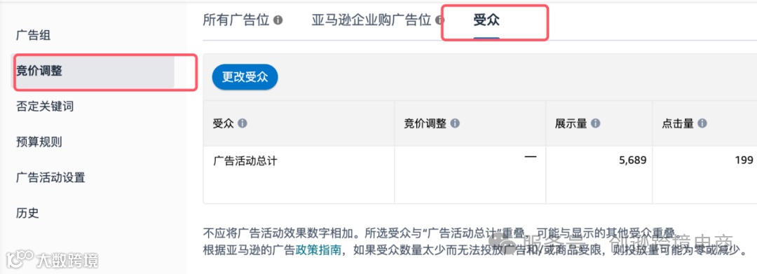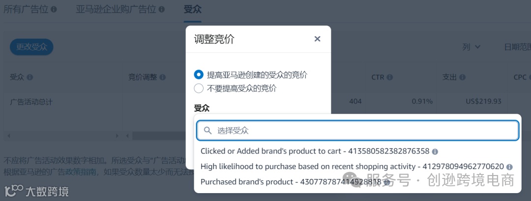 使用路径为:SP广告活动 > 竞价调整 > 受众选项 > 更改受众 > “不要提高受众的竞价”。根据选择方式不同,可分为以下两种模式: