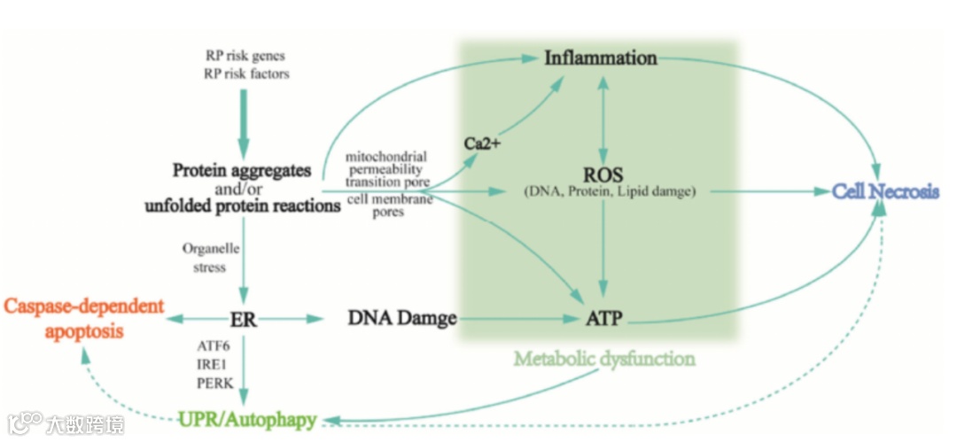 致病基因突变直接造成两种主要初始损伤:其一,错误折叠的突变蛋白在内质网中积累(如RHO基因突变),触发未折叠蛋白反应;当内质网应激持续且无法代偿时,通过钙离子释放及caspase-12等效应分子激活内源性凋亡通路。其二,纤毛相关基因(如RPGR)突变干扰纤毛内运输功能,致使外节盘膜更新障碍,扰乱cGMP代谢与钙离子稳态,持续高钙环境激活钙依赖性蛋白酶,进而损伤细胞骨架并启动凋亡程序。