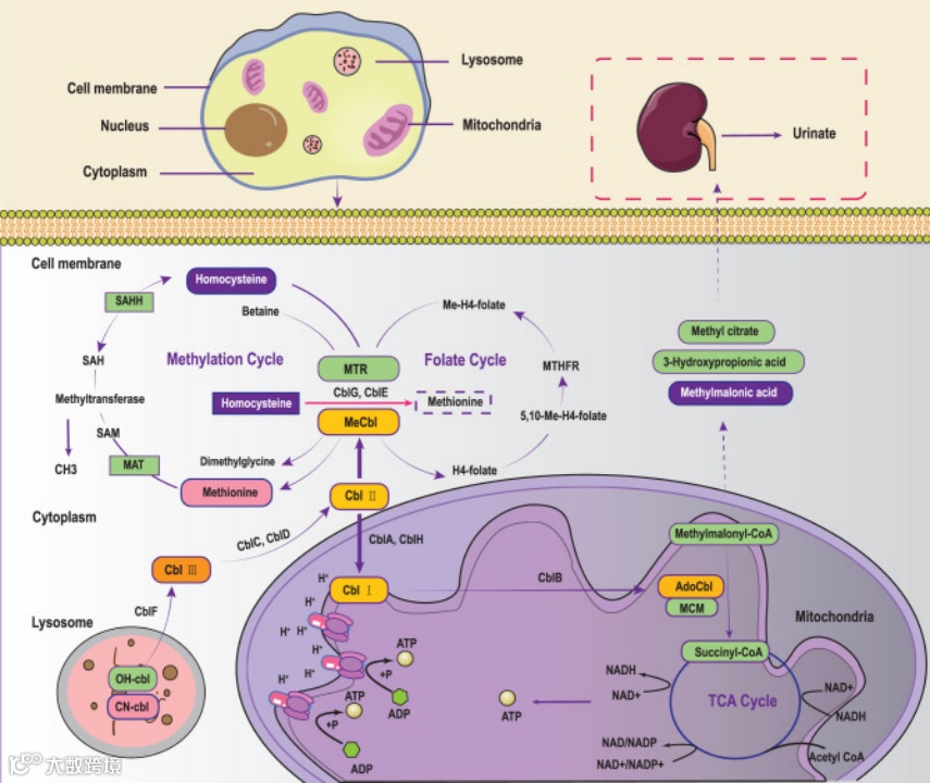 MMA主要分为两大类:MCM缺陷型(Mut型)和钴胺素代谢障碍型(cbl型)。Mut型由MMUT基因突变导致,包括酶活性完全丧失的mut⁰型和部分缺陷的mut⁻型。cbl型涉及多种基因(如MMAA,MMAB,MMACHC等)突变,导致维生素B12代谢异常,进而影响MCM的活性。其中,cblC、cblD、cblF型患者因同时伴有同型半胱氨酸血症,被称为合并型MMA,约占我国患者的70%。