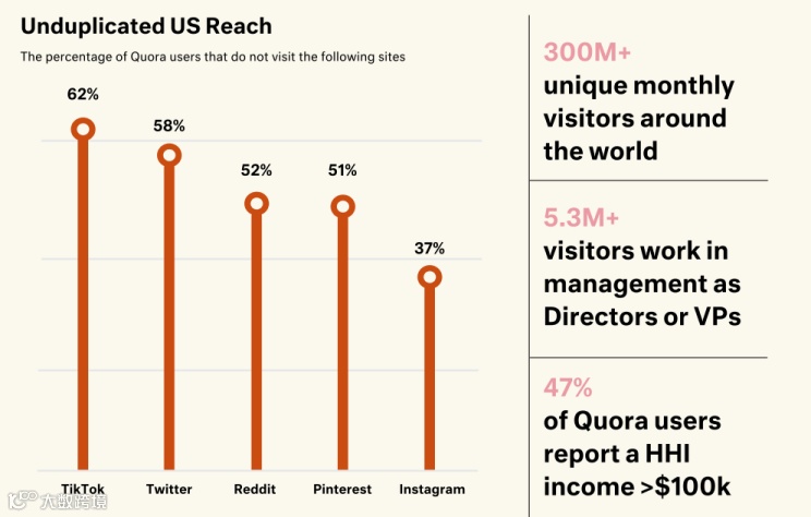 Quora 是一个集社交和搜索双属性的一个知识问答平台。用户在平台内可针对某个领域或话题,进行获取学习信息、评估产品、提问、分享回答等行为互动。Quora是帮助广告主触及潜在用户,实现有效推广和引流的理想营销阵地。