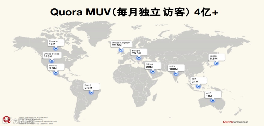 Quora每月独立访客数量超过4亿,分布在全球各个市场地区,主要集中于美国、欧洲与印度等国家。平台内容被Google搜索高频收录,有75%左右的流量源自谷歌等搜索引擎,形成了强大的自然流量池。