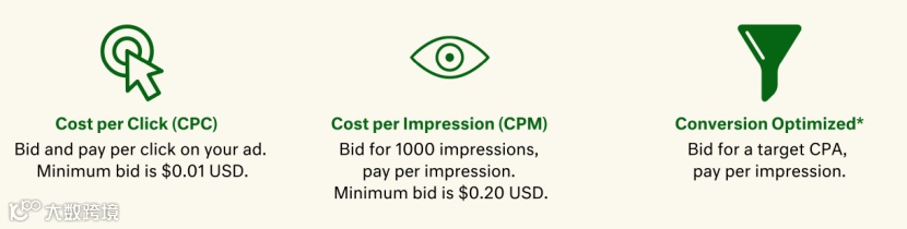 广告主可以选择基于 CPC、CPM 和 CPA 的竟价方式。