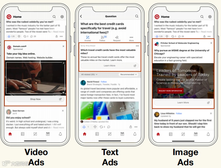 在Quora,广告主可以通过视频广告、文本广告、图片广告、回答推送以及问卷广告形式进行营销,也可以利用回答推送+问卷广告的混搭模式发布广告。