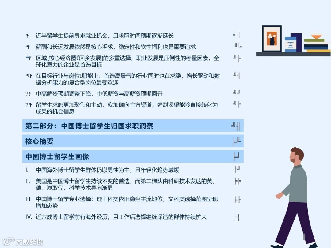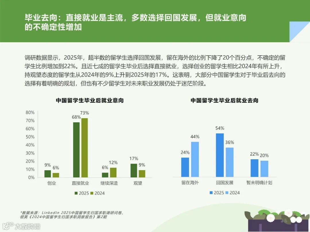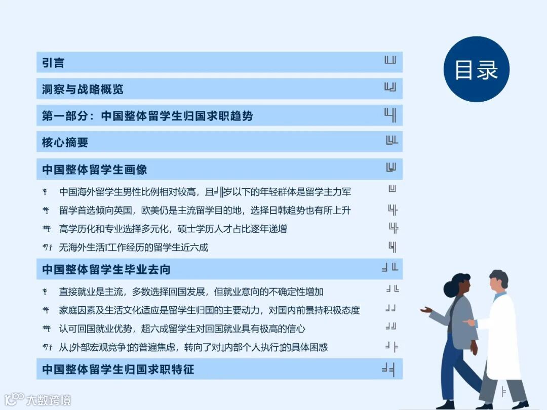 英国、美国仍是主流留学地,日韩吸引力上升;58%留学生无海外工作经历,但通过学习能力填补经验空白。 -