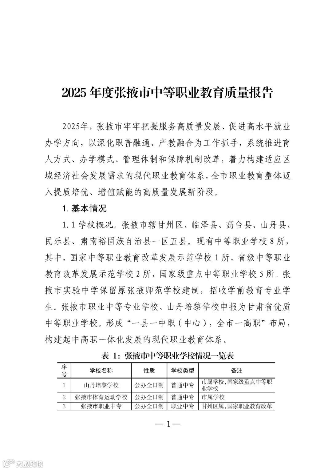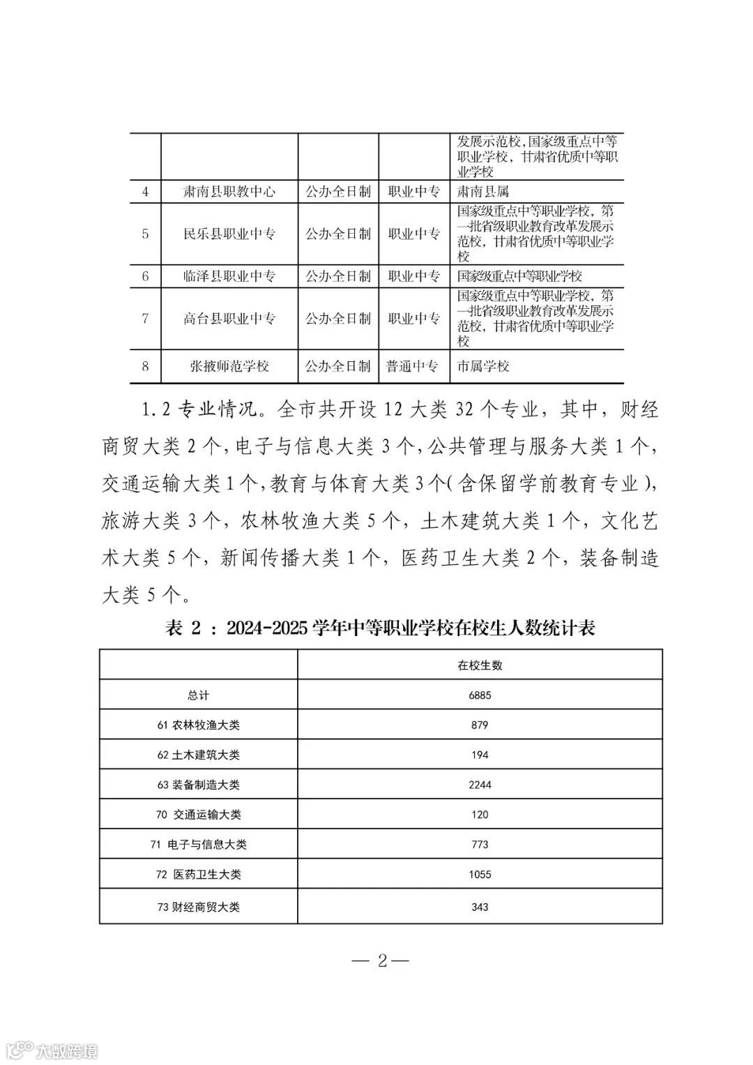 2025年,张掖市中等职业教育紧扣服务高质量发展、促进高水平就业的办学方向,以深化职普融通、产教融合为工作抓手,系统推进育人方式、办学模式、管理体制和保障机制改革,着力构建适应区域经济社会发展需求的现代职业教育体系,全市职业教育整体迈入提质培优、增值赋能的高质量发展新阶段。全市现有8所中等职业学校,形成“一县一中职(中心),全市一高职”的布局,涵盖12大类32个专业,在校生6885人。