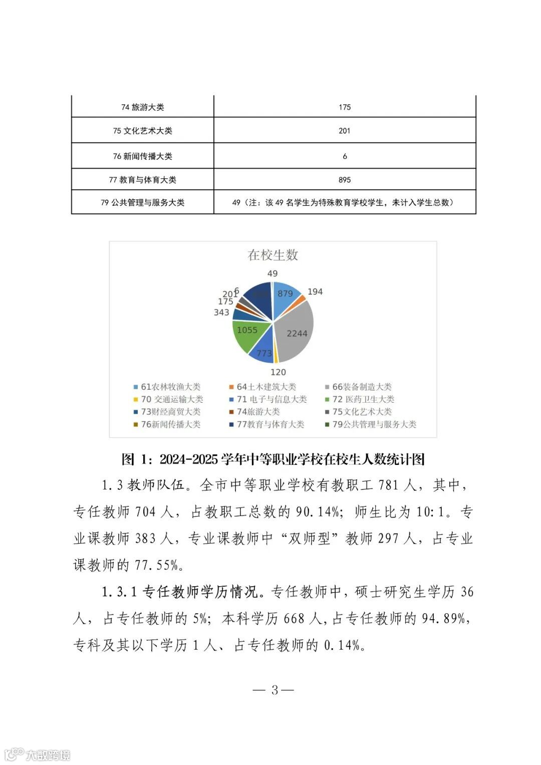 全市中等职业学校教职工共781人,专任教师中本科学历占比达94.89%,“双师型”教师占专业课教师的77.55%,师资队伍整体素质高,具备较强的教学和实践指导能力。
