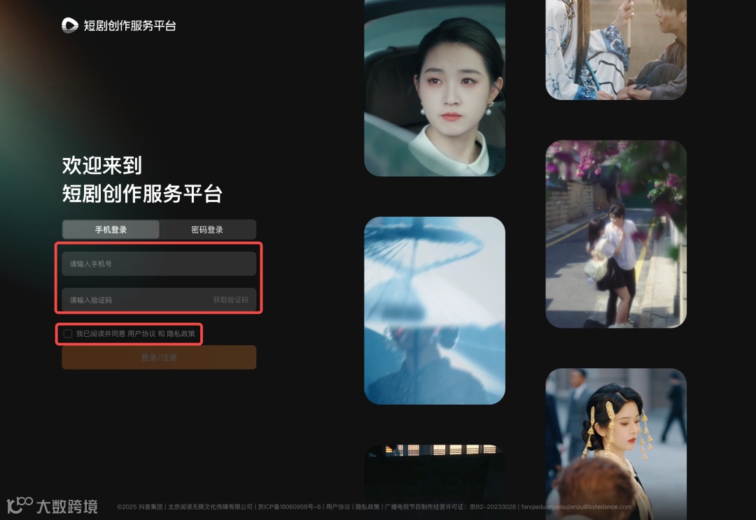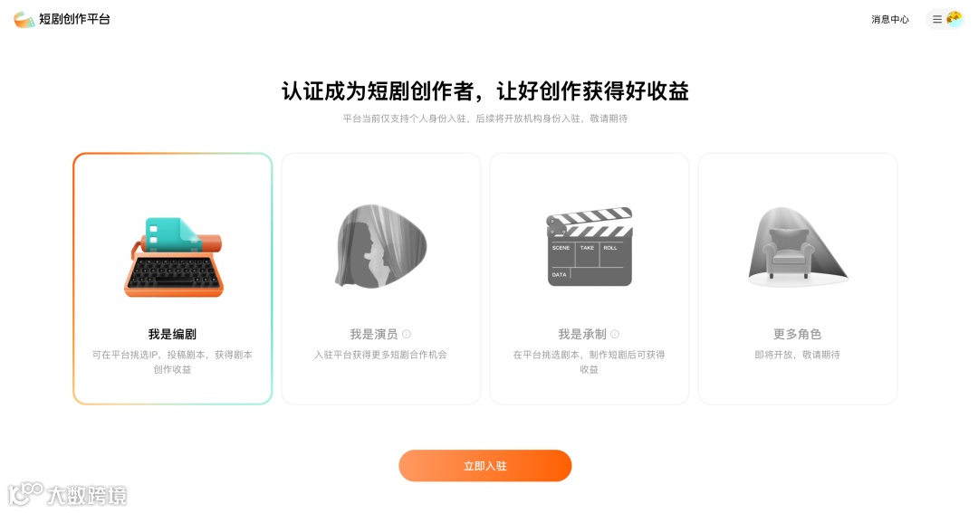 入驻:手机号注册以后,需进行实名认证,并选择自己实际的短剧创作身份,选择成功后在平台获得对应功能权限,完成个人实名认证入驻,如需以企业主体入驻,需要先完成个人实名认证。