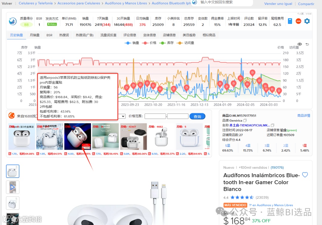 如上图所示,蓝鲸选品插件已接入1688平台,能够快速识别查询商品,并显示来自不同供应商的采购价格。该功能还能自动扣除佣金和尾程费用,直观呈现商品的毛利情况,大大简化了原本复杂的计算步骤。