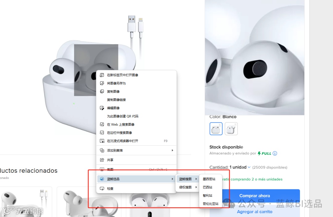 安装蓝鲸选品插件后,在浏览器页面中右键点击图片并选择“蓝鲸选品”下的“蓝鲸搜图”,即可迅速找到美客多平台上正在销售该商品的链接及其销售数据。