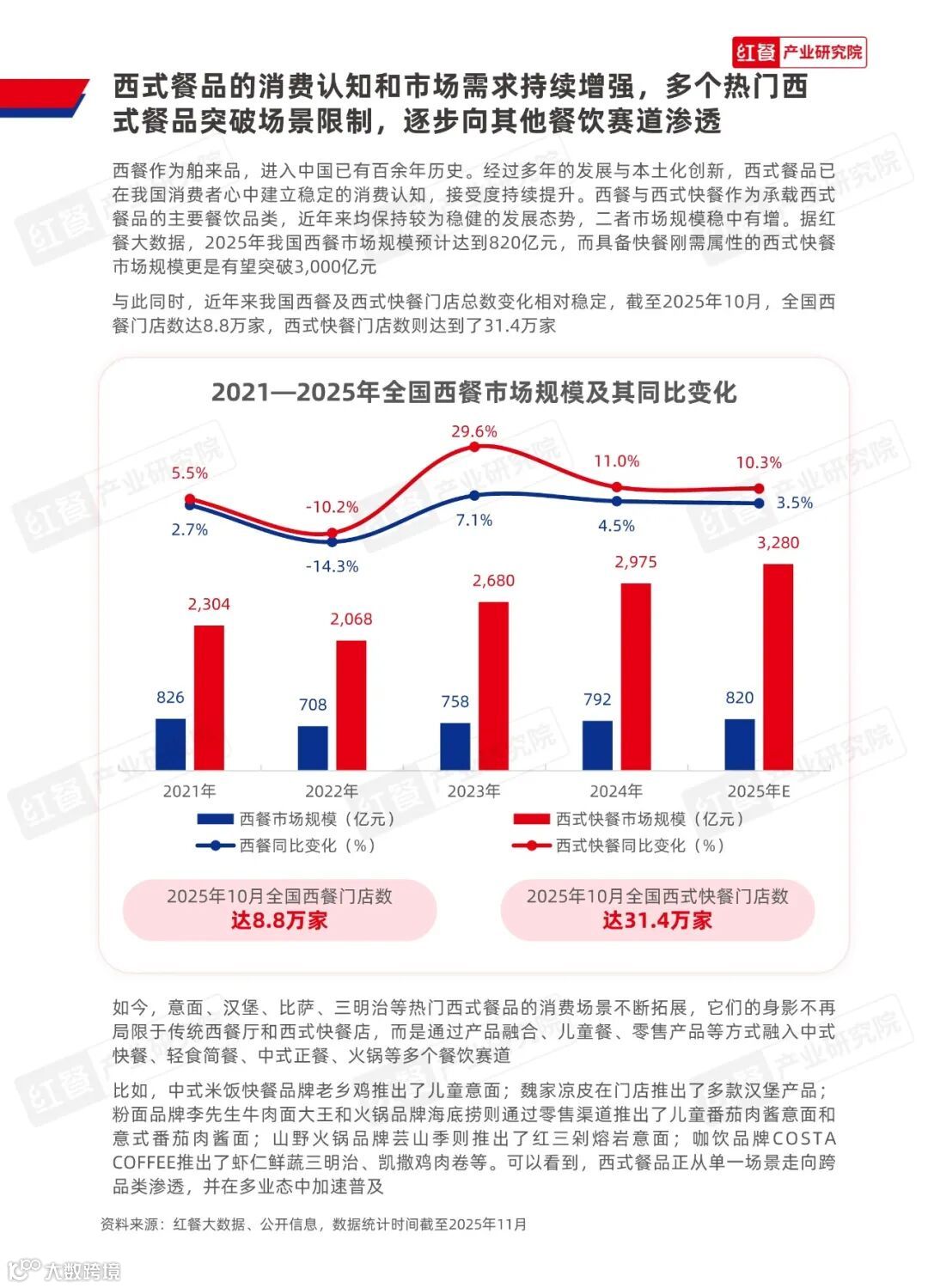 2025年中国西餐市场规模预计达820亿元,西式快餐市场规模突破3,000亿元,凸显快餐刚需属性。 -