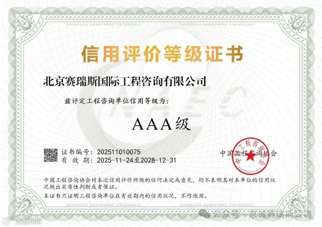 中冶京诚赛瑞斯凭借良好信用、优质服务,喜获2025年中国工程咨询协会信用评价等级AAA级称号。