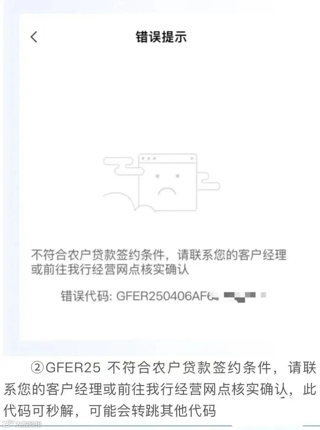 二,GFER25+月日+一串乱码,不符合农户贷款签约条件,请联系您的客户经理或者前往我行经营网点核实确认