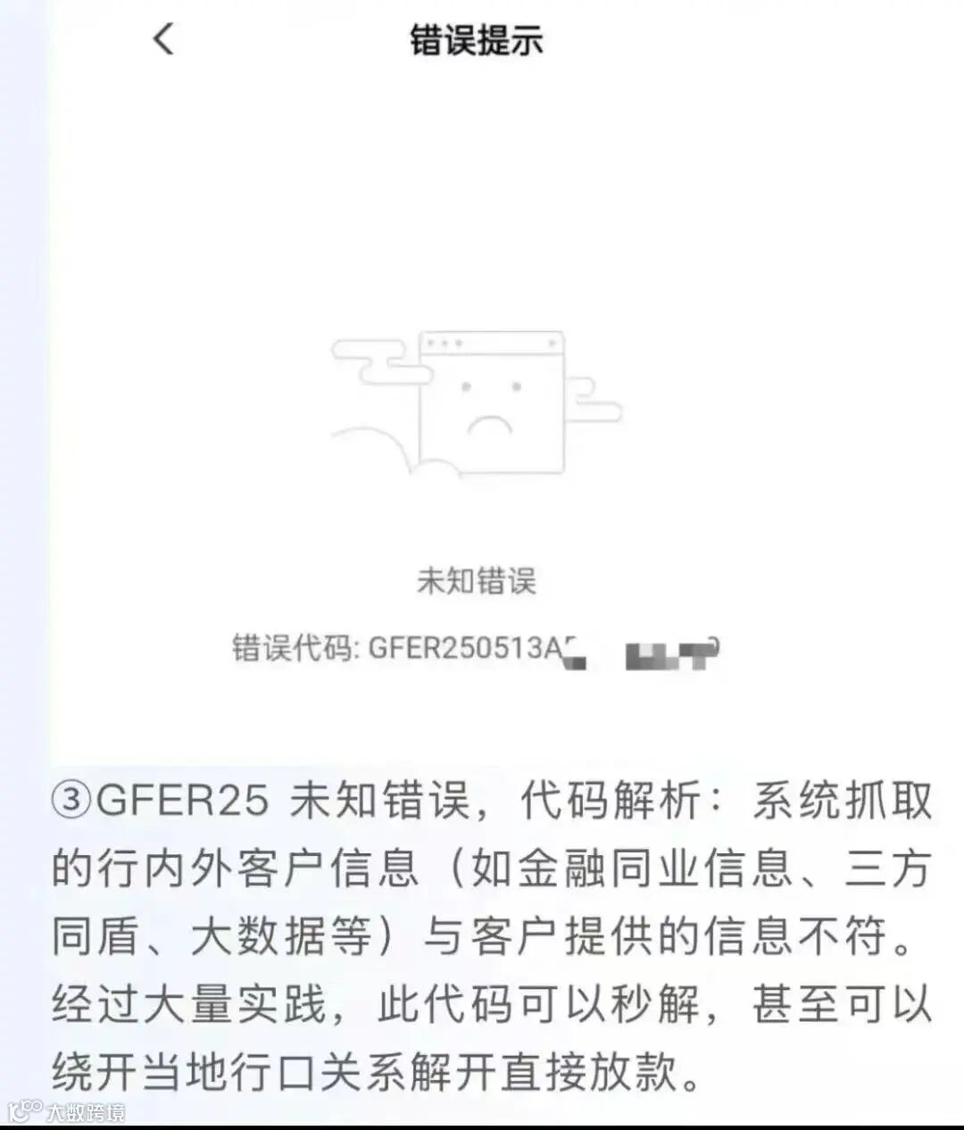 三,GFER25+年日,未知错误,代码解析:系统抓取的行内外客户信息(如金融同业信息,三方同盾,大数据等)与客户提供的信息不符。