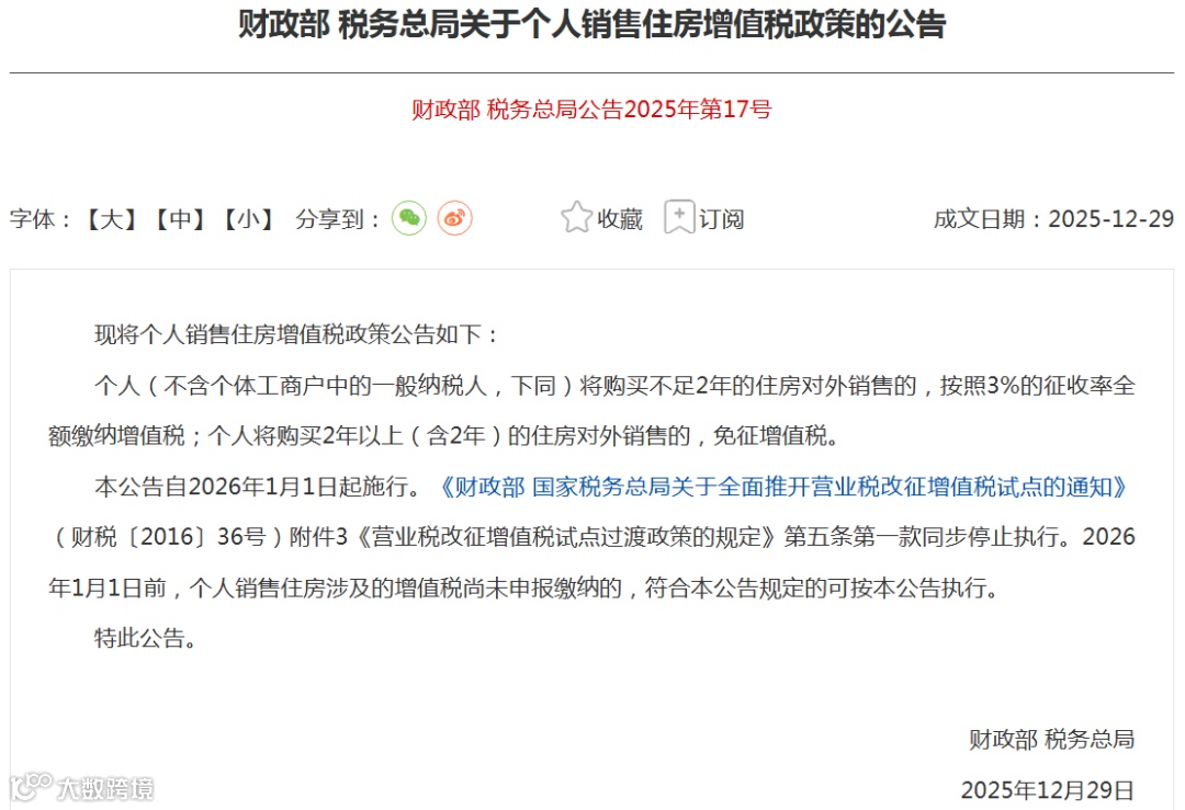 12月29日,财政部、国家税务总局发布“关于个人销售住房增值税政策的公告”,针对二手房交易的核心税费之一增值税进行调整。