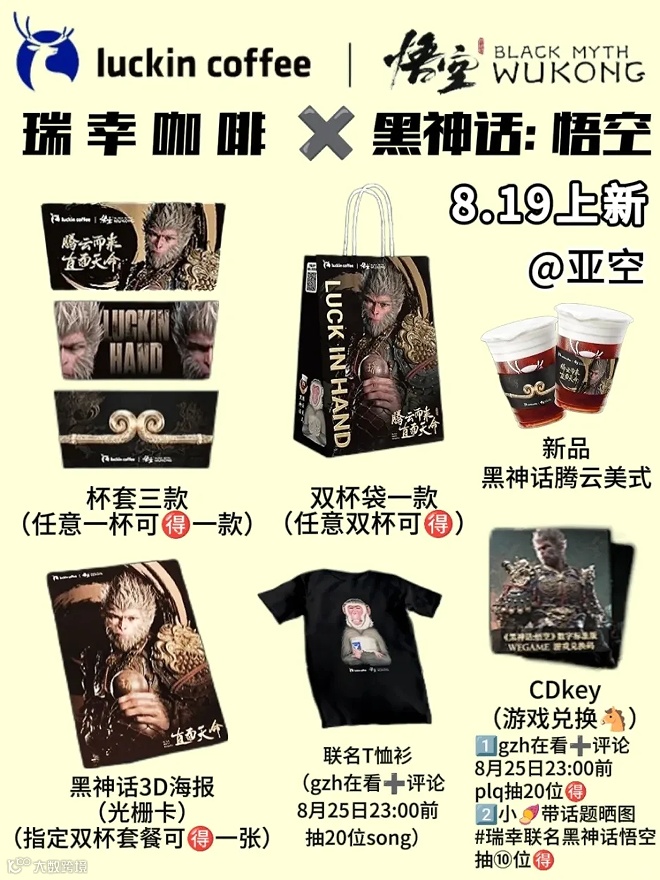 此外,瑞幸咖啡继去年与茅台成功合作后,再次与《黑神话:悟空》合作。此次合作商品在几秒钟内就售罄。该品牌宣布补货需要 15 天时间,这在网上引起了一些 强烈反响。