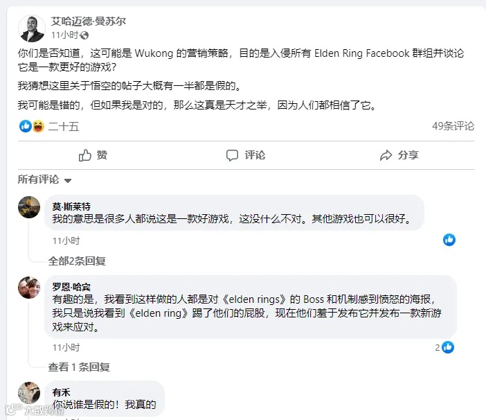 Wukong甚至打入了Elden Ring Facebook 群组,海外网友怀疑这也是Wukong的一种营销手段。