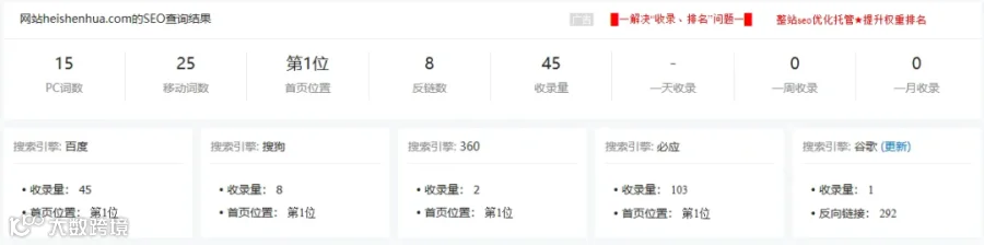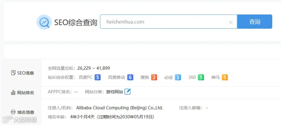 通过某站长查询工具可看出域名heishenhua.com全网综合流量26229——41899,各个网站首页位置均为第一,收录量极高。