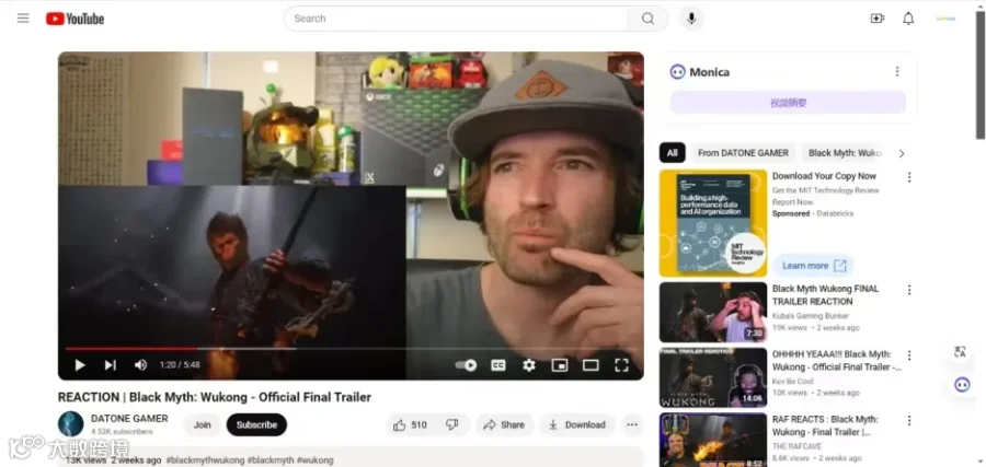此外,YouTube上的游戏博主DATONE GAMER也是合作对象之一。他通过观看86版《西游记》并制作reaction视频,以自身对孙悟空故事背景的了解,为《黑神话:悟空》吸引了大量玩家的注意。