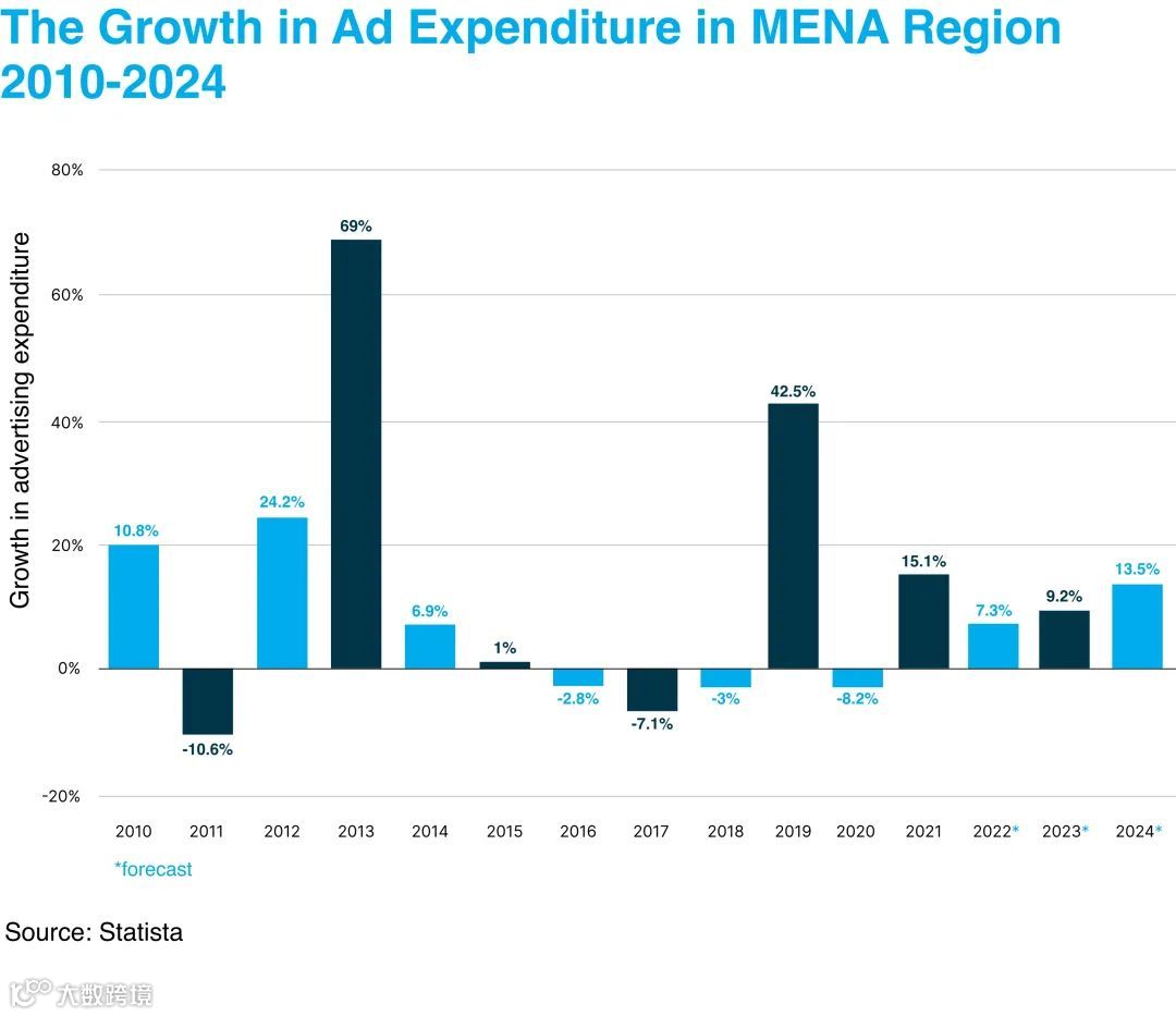 中东和北非 (MENA) 地区的广告业正在经历重大转型。预计到 2024 年,广告支出将超过120 亿美元,较 2021 年的约 92 亿美元大幅增加。这表明 MENA 地区的广告领域具有巨大的增长潜力。