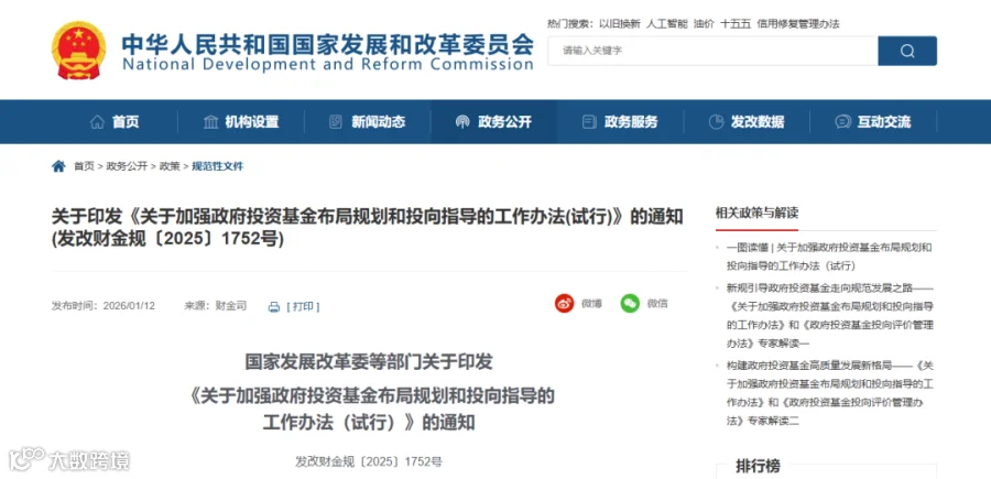 为贯彻落实党中央、国务院决策部署,根据《国务院办公厅关于促进政府投资基金高质量发展的指导意见》(国办发〔2025〕1号)要求,加强对政府投资基金布局规划和投向指导,更加突出政府引导和政策性定位,现制定《关于加强政府投资基金布局规划和投向指导的工作办法(试行)》。现印发给你们,请按照执行。