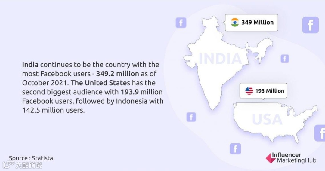 印度拥有3.146亿的Facebook用户,成为该平台最多用户的国家。紧随其后的是美国,拥有1.75亿的Facebook用户。其次使用较多的国家有印度尼西亚、巴西、墨西哥、菲律宾和越南。