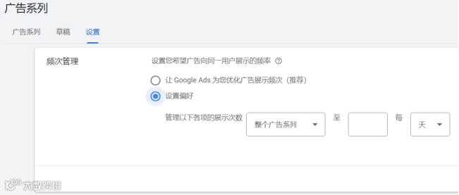 3、选择频次管理,您可以让Google Ads为您优化广告展示频次,也可以自主设置偏好。设置好次数与时间间隔后点击保存即可。