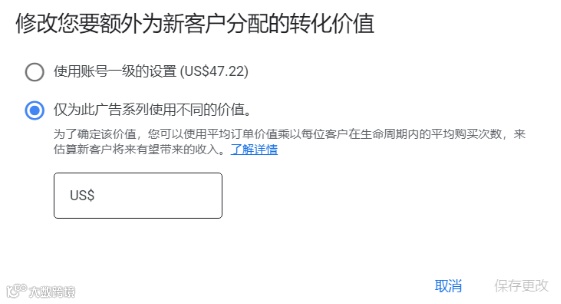 同样地,如果要使用此功能,需要在该广告系列中添加至少一个活跃成员大于1000的细分受众群,然后设置新客户额外价值即可。