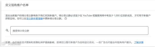 要使用新客户获取目标,还需要添加一个细分受众群,且该细分受众群必须在至少一个广告网络中有至少 1,000 位活跃成员,以识别现有客户群体。
