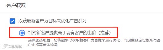 新客户获取目标可以帮助您通过 Google Ads 广告系列高效获取新客户,目前它适用于效果最大化广告系列和搜索广告系列。在创建广告系列时,我们可以直接在出价选项内设置客户获取,其两种模式如下: