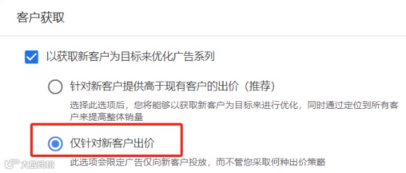 (2)仅针对新客户出价(“仅限新客户”模式):仅面向刚接触您业务的客户来展示广告。在此模式下,系统不会再针对现有客户出价,智能出价将会针对“尽可能提高转化次数”/“目标每次转化费用”(tCPA) 出价策略或“尽可能提高转化价值”/“目标广告支出回报率”(tROAS) 出价策略进行优化。如果您具有专门用于获取客户的预算,或者您投放的广告系列以促成非购买转化为目标(例如潜在客户发掘广告系列),那么您可以采用此模式。