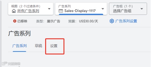 1、我们在制作新的广告系列时,无法调整频次上限,必须先完成制作后才能设置频次上限。首先,我们选择已经制作好的展示广告,点击设置。