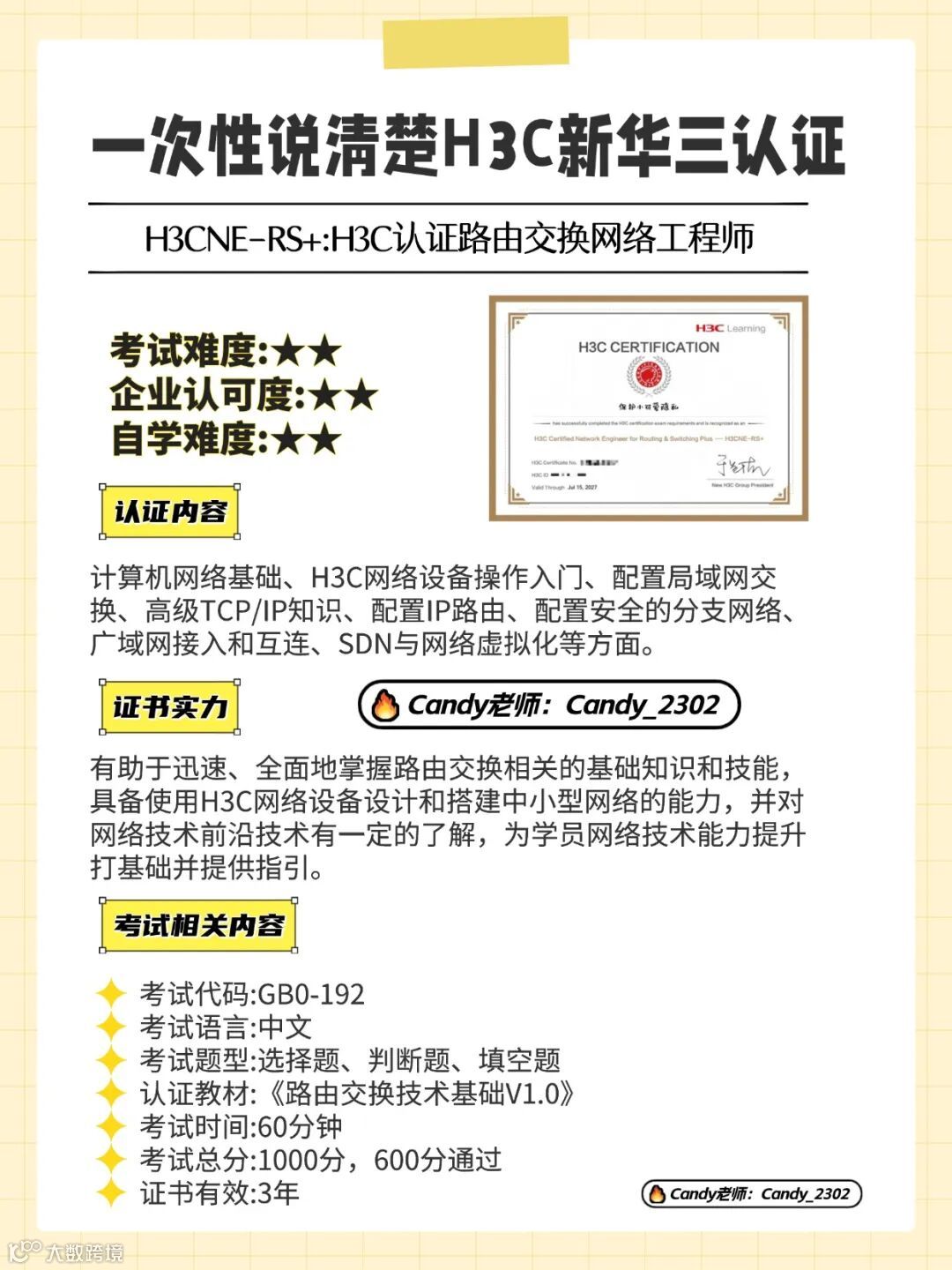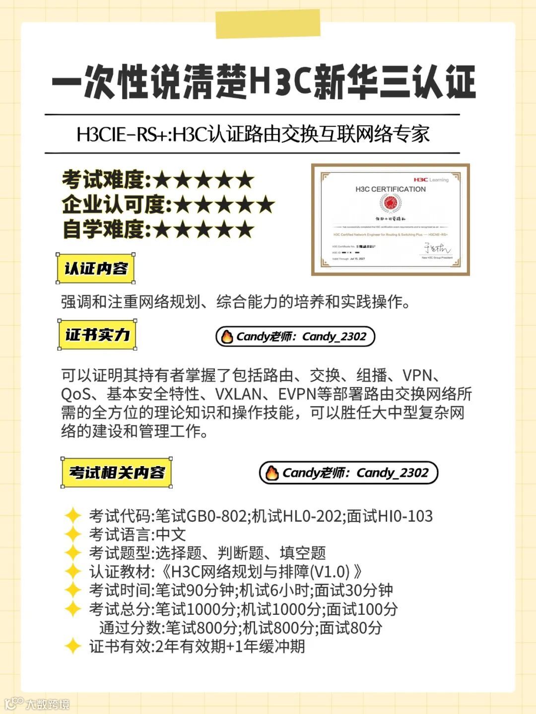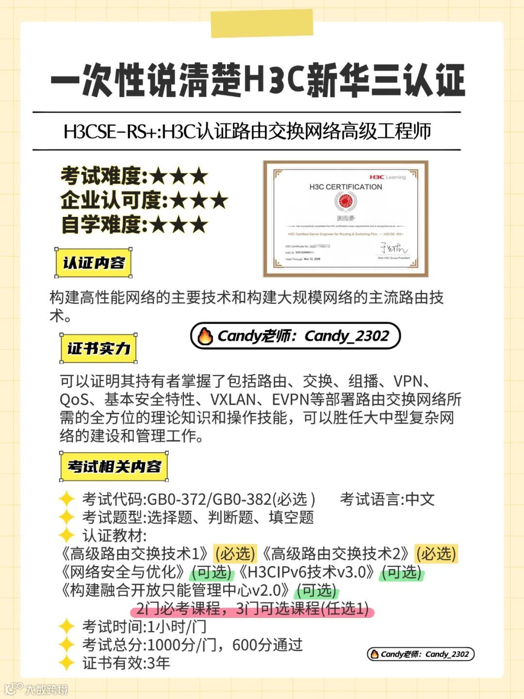 备考建议:H3CNE/H3CSE 系统学习 1-2 周通过率较高,考试当场出成绩,需妥善保管纸质成绩单。