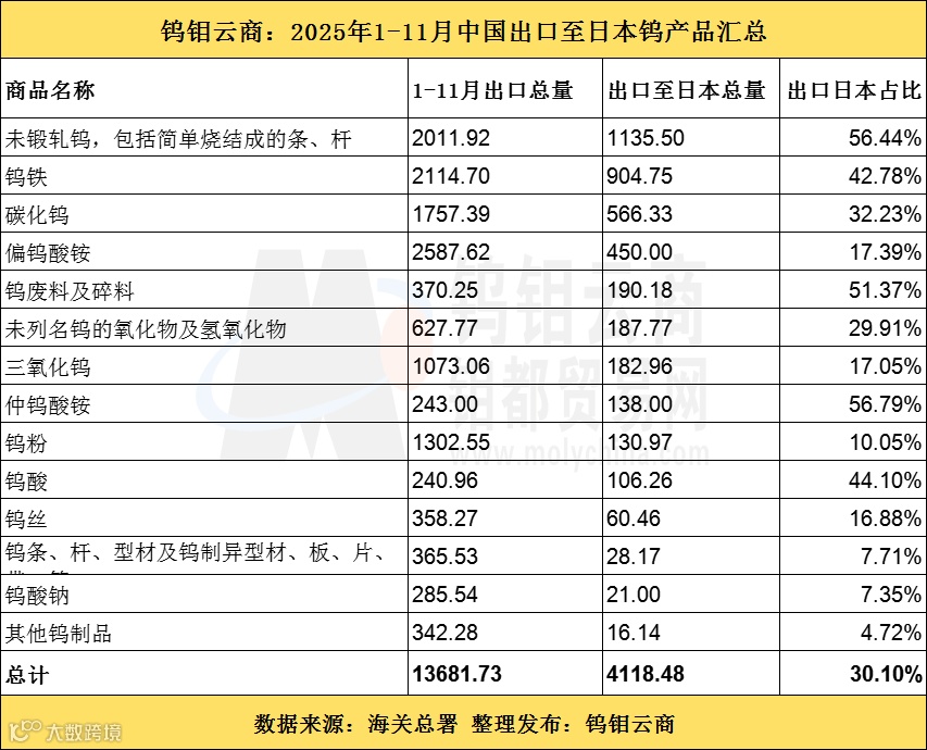 据钨钼云商统计数据显示:2025年1-11月中国出口至日本钨产品总量4118.48吨(实物吨、下同),占同期中国钨出口总量的30.1%。