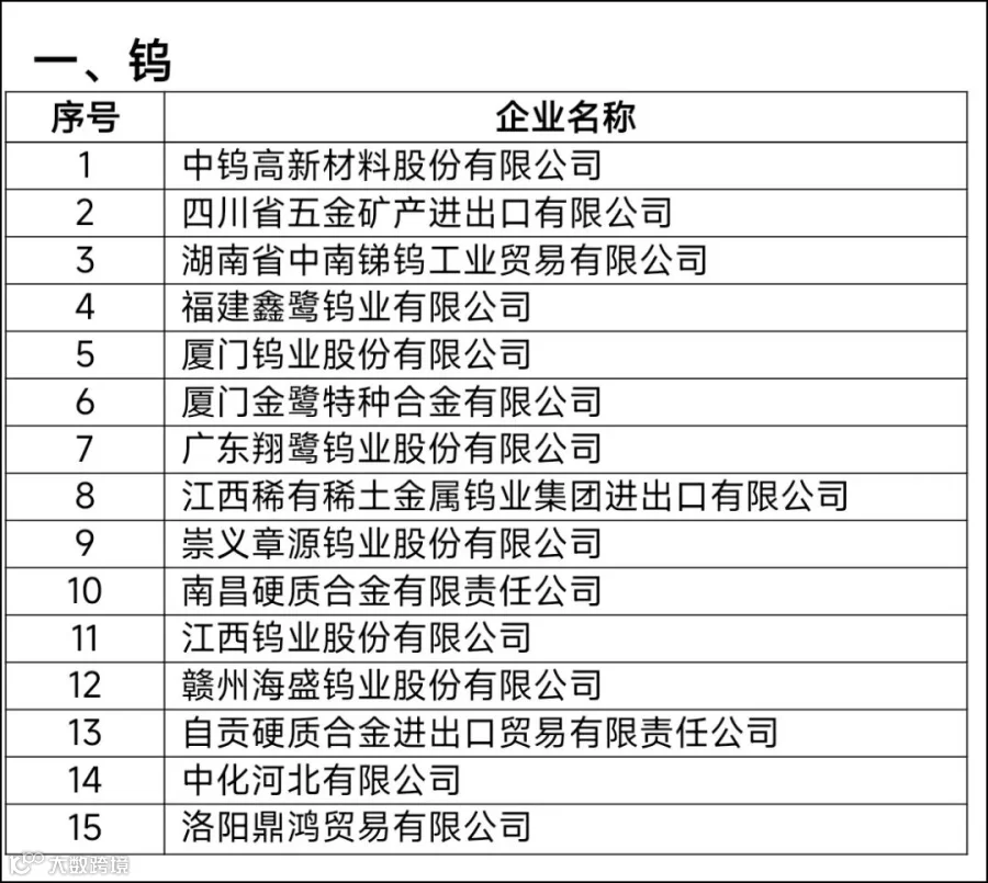 在申报期限内,共有16家企业递交了钨出口国营贸易资质申请材料,经审核,其中14家为已获得资质的企业且符合公告要求;1家新申报企业符合公告要求;1家新申报企业不符合公告要求。符合钨出口国营贸易资质的企业名单如下: